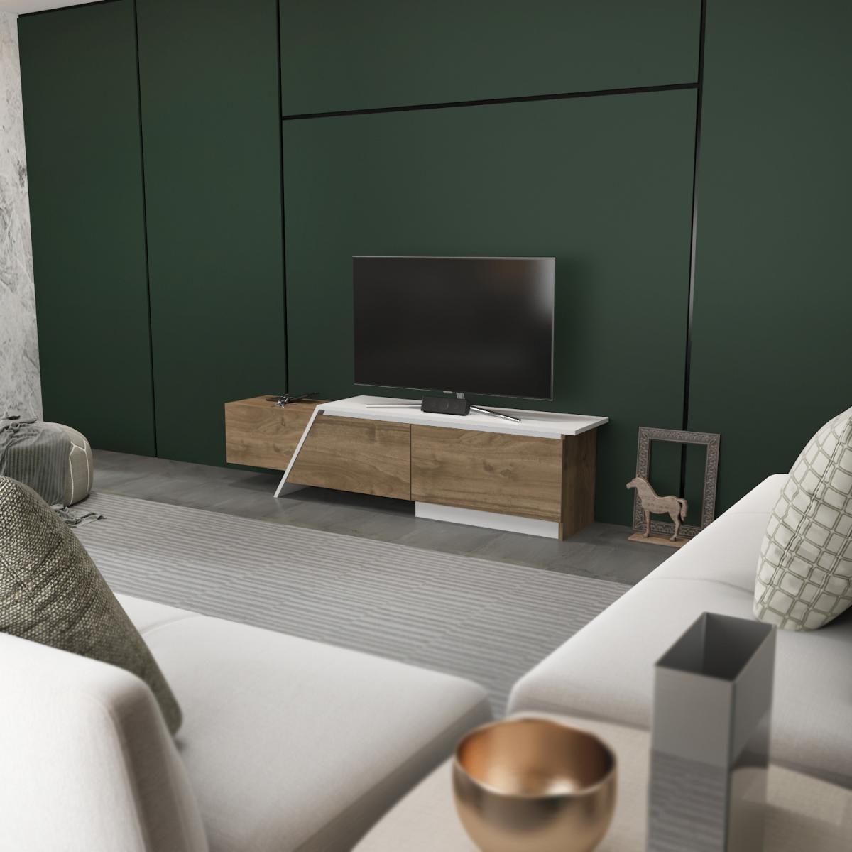 Zonas 180cm wide TV stand and media console, for TVs up to 55" will shine in your room with its asymmetric and modern look. It has 2 drop-down cabinets and 1 regular cabinet that will provide huge storage for your books, magazines and everything that you want to put somewhere out of sight. The media stand is made of 18mm thick quality melamine coated particle board and banded with first-class PVC edge banding tape. It is manufactured using eco-friendly and health-friendly TSE-certified materials. The product will be delivered to the customer in the original package as disassembled. It is designed to be assembled by the customer easily using simple household tools like a power drill. Assembly instructions and installation hardware are included in the package. For fast and error-free installation, product parts are numbered with stickers in accordance with the assembly guide.