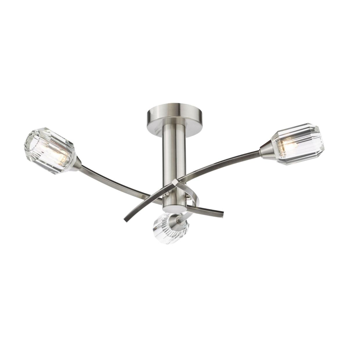 Zonda 3-light semi-flush ceiling light, featuring three sweeping arms, faceted glass shades and a brushed nickel finish. The Zonda semi-flush ceiling light brings a harmonious blend of elegance and modern design to your interiors. It features three gracefully sweeping arms that radiate from the center, adding a sense of movement and sophistication to its structure. Each arm supports a faceted glass shade, designed to refract light beautifully, creating a warm and inviting ambiance in any room. Crafted with a brushed nickel finish, this ceiling light exudes contemporary charm while offering durability and a timeless aesthetic. Its semi-flush design makes it a perfect fit for rooms with lower ceilings, while still providing a striking decorative feature. Zonda 3-light semi-flush ceiling light, featuring three sweeping arms, faceted glass shades and a brushed nickel finish. The Zonda semi-flush ceiling light brings a harmonious blend of elegance and modern design to your interiors. It features three gracefully sweeping arms that radiate from the center, adding a sense of movement and sophistication to its structure. Each arm supports a faceted glass shade, designed to refract light beautifully, creating a warm and inviting ambiance in any room. Crafted with a brushed nickel finish, this ceiling light exudes contemporary charm while offering durability and a timeless aesthetic. Its semi-flush design makes it a perfect fit for rooms with lower ceilings, while still providing a striking decorative feature.