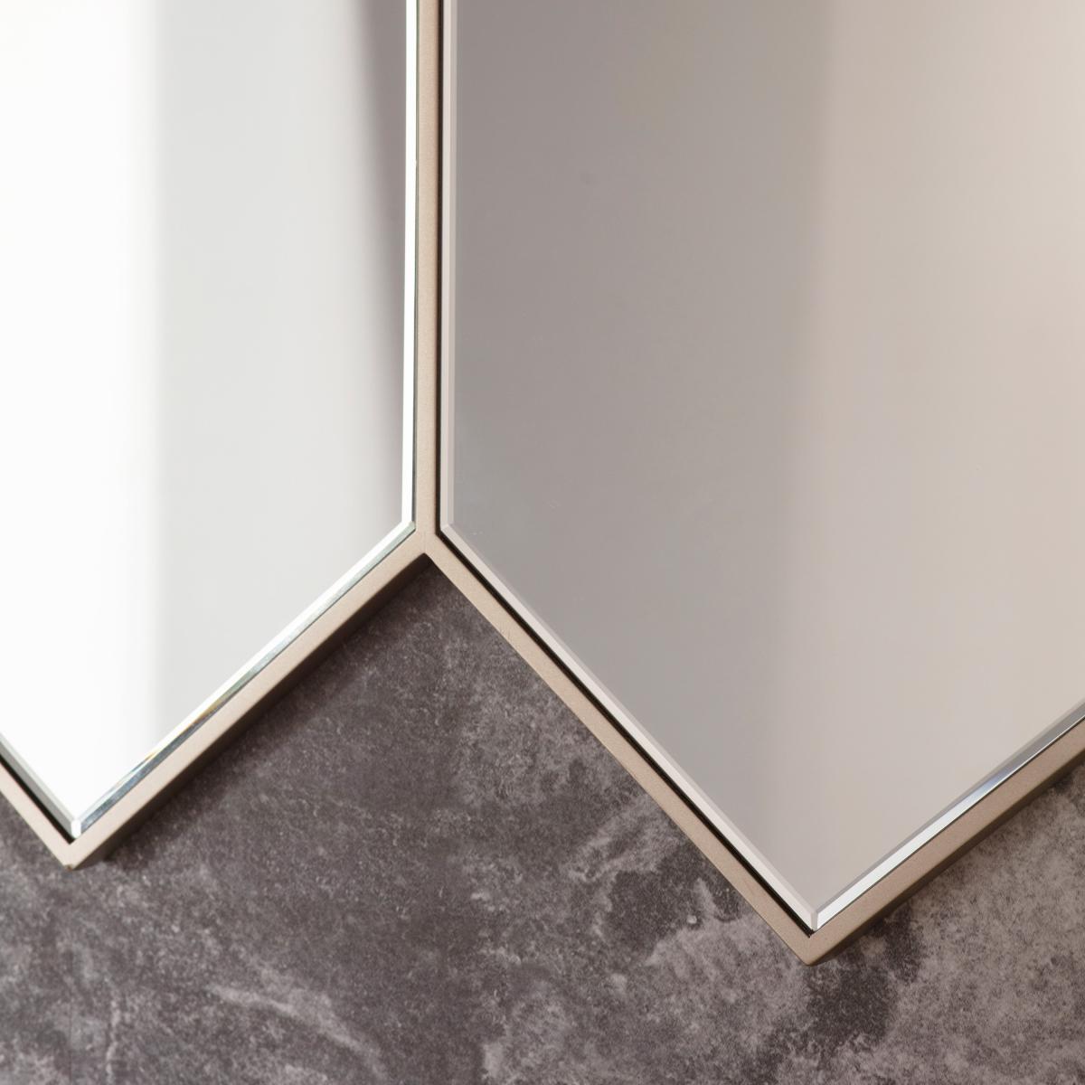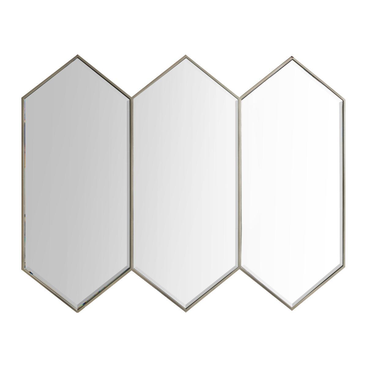 Introducing an eye-catching geometric mirror that will add a dash of vintage inspired elegance to your home. Featuring three irregular hexagons with subtle silver metal frames, this accent mirror is perfect for adding an eye-catching finishing touch to any room. Hang your new wall mirror using our helpful top tips, click. Here. To view.