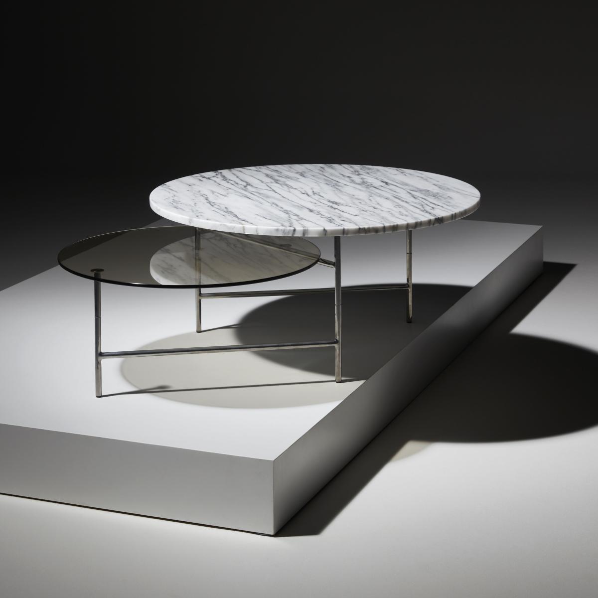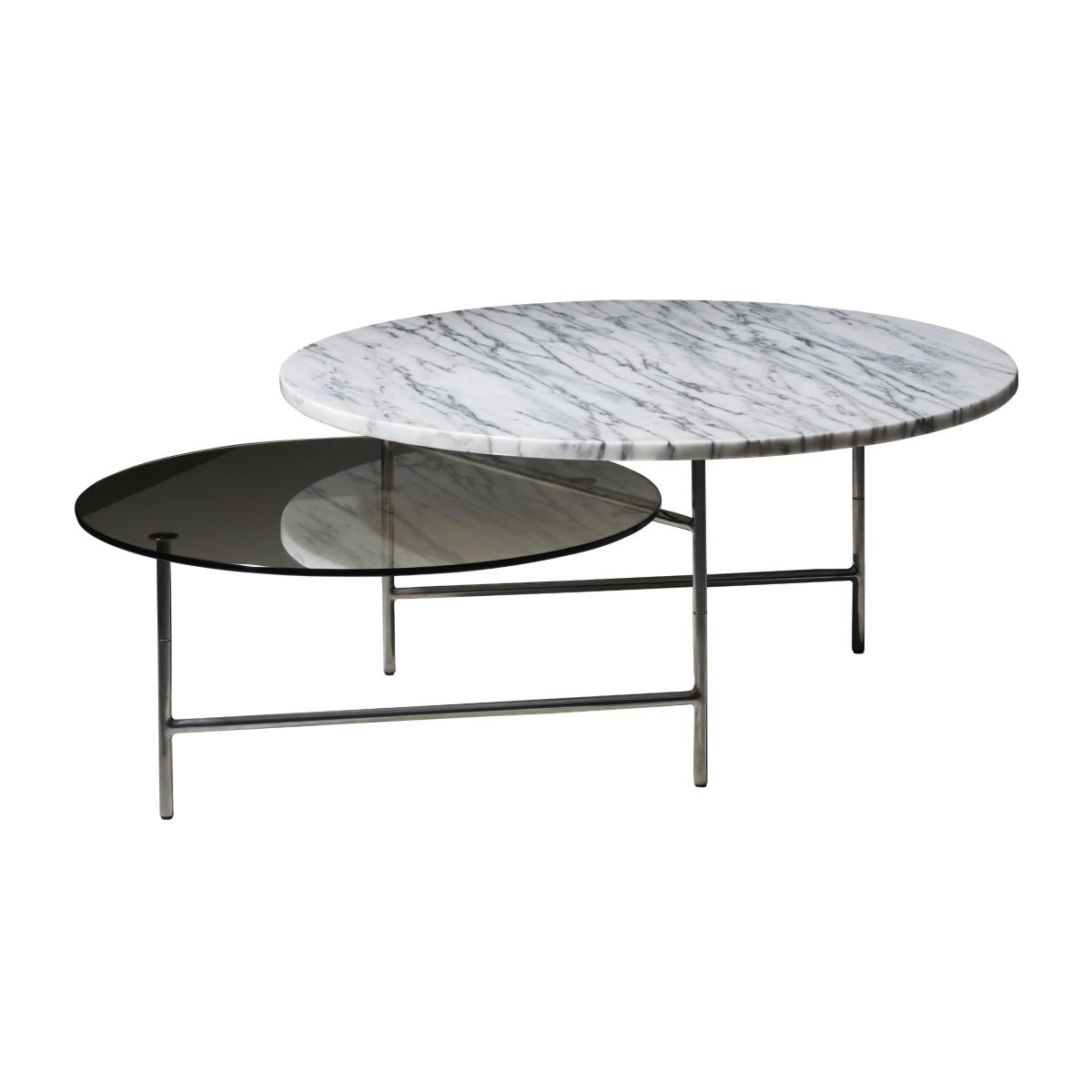 Ultra-elegant, this two-top coffee table features a harmonious marriage of noble materials: white Tiger Peel marble, grey smoked glass and chromed steel structure. It features a minimalist, ingenious Z-shaped structure that supports the two overlapping, mirrored Tray tops. Zorro appears to combine two tables into one.