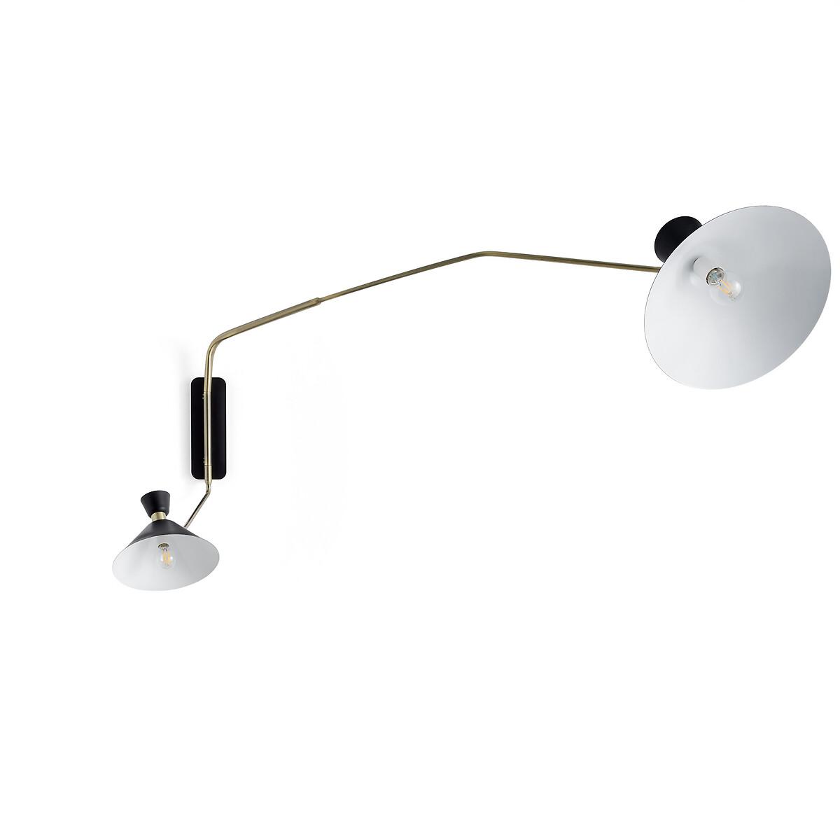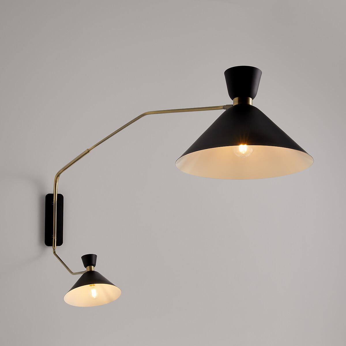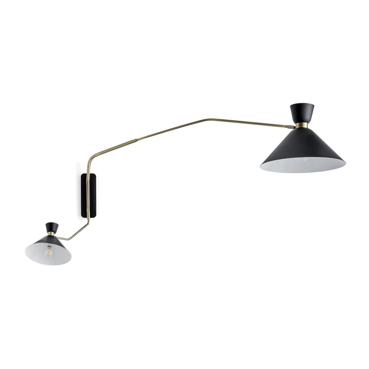 Bring a touch of 1950's style to your home with this adjustable wall light crafted in striking black and brass metal. Decorative and functional, its 2 adjustable shades of different sizes offer targeted lighting:Product Details • In epoxy and brass-effect iron • 1 E14 socket for compact fluorescent bulb 8W max (not supplied) • 1 E27 socket for compact fluorescent bulb 15W max (not supplied) • Compatible with energy class A-E bulbs. Dimensions • Wall plate: H250 x L90cm • Large shade: Diameter 35cm • Arm length: 158cm • Small shade: Diameter 22.8cm • Overall Dimensions • Length: 158.4cm • Width: 35cm • Height: 76.7cm Parcel Dimensions • L161 x H62 x D36cm. 6.9kg.