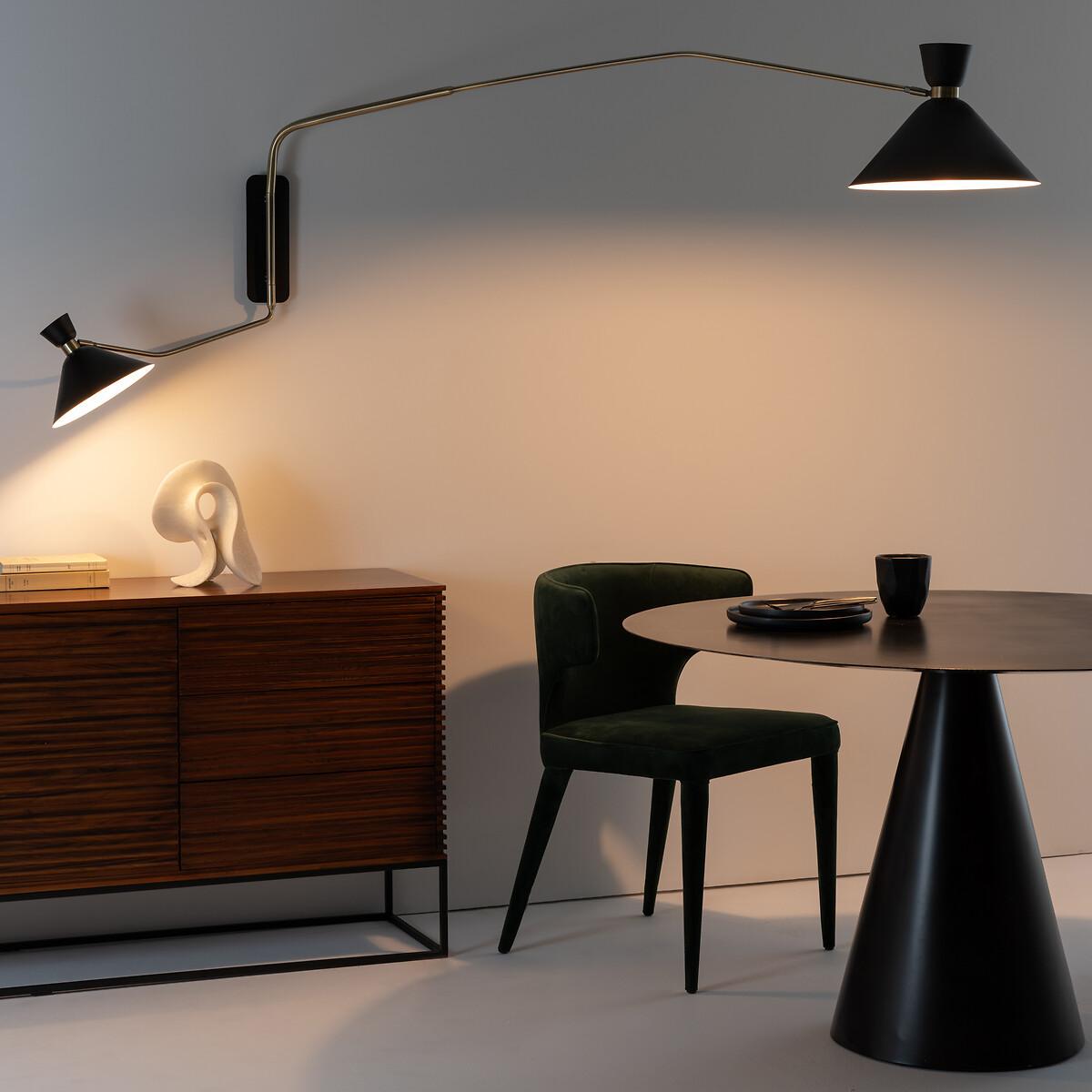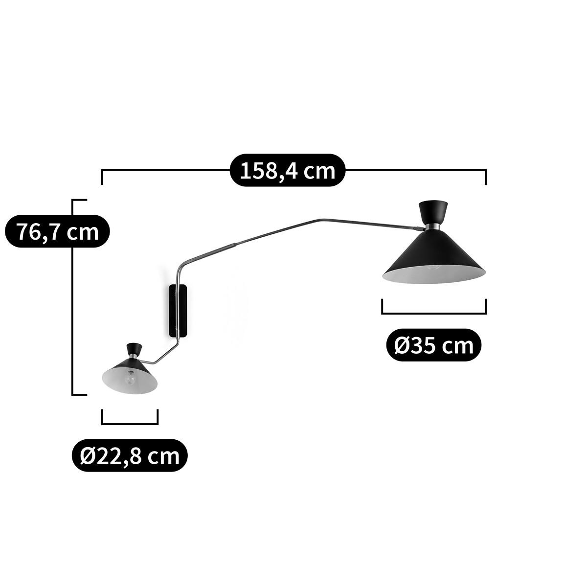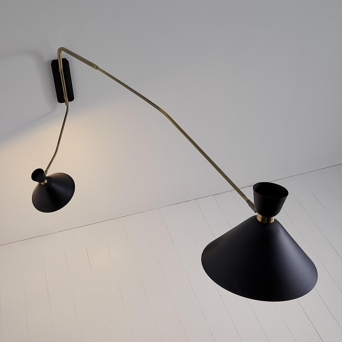 Bring a touch of 1950's style to your home with this adjustable wall light crafted in striking black and brass metal. Decorative and functional, its 2 adjustable shades of different sizes offer targeted lighting:Product Details • In epoxy and brass-effect iron • 1 E14 socket for compact fluorescent bulb 8W max (not supplied) • 1 E27 socket for compact fluorescent bulb 15W max (not supplied) • Compatible with energy class A-E bulbs. Dimensions • Wall plate: H250 x L90cm • Large shade: Diameter 35cm • Arm length: 158cm • Small shade: Diameter 22.8cm • Overall Dimensions • Length: 158.4cm • Width: 35cm • Height: 76.7cm Parcel Dimensions • L161 x H62 x D36cm. 6.9kg.