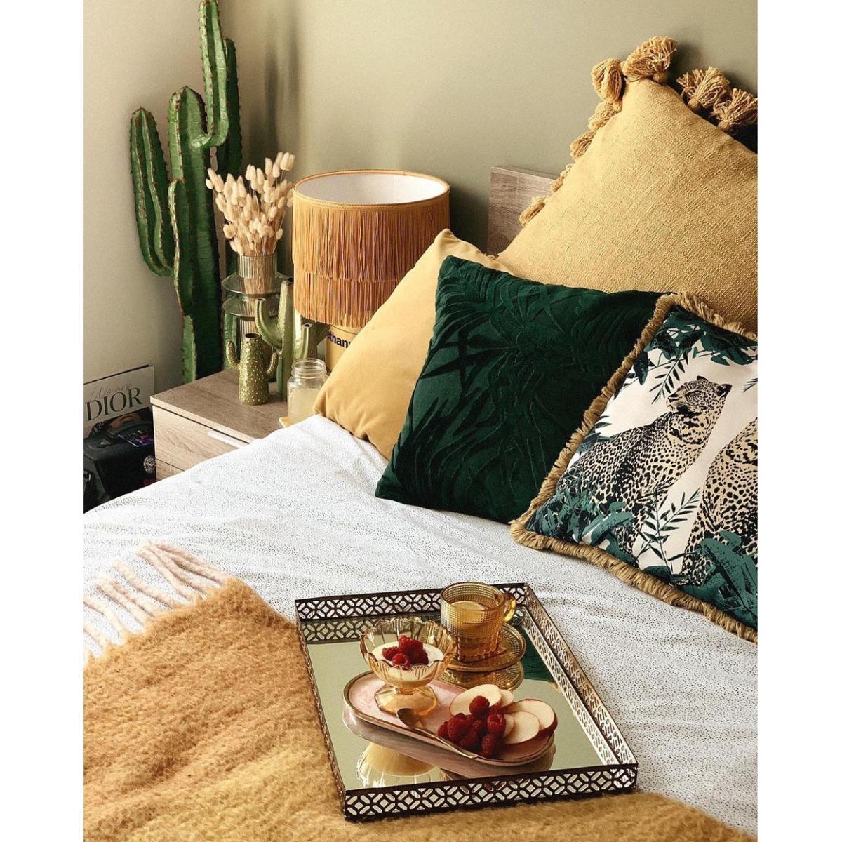 This palm print cushion is a great way to add a touch of tropical flair to both modern and bohemian interiors. I love its bold, leafy pattern, which works particularly well in relaxed living rooms or conservatories. It’s versatile enough to pair with neutral sofas or other textured textiles, creating a layered look. Practical styling tips include using it as a statement piece on a linen sofa or mixing it with other botanical accents for a cohesive theme. Its rich green colour also provides a fresh burst of colour without overwhelming the space, making it a stylish yet subtle addition to your decor.