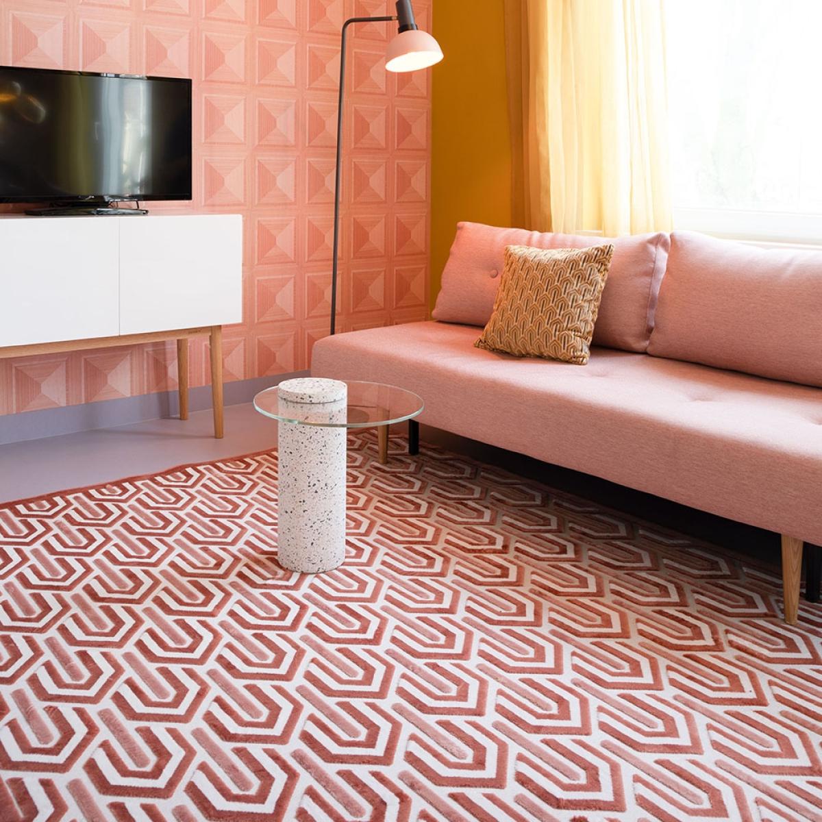 This pink rug is a fantastic way to introduce colour and warmth into a range of interiors. Its size makes it versatile for living rooms, bedrooms, or even larger hallways, anchoring furniture arrangements and adding visual interest. I love that the muted pink tone offers a soft, modern feel without overpowering the space, making it suitable for both contemporary and eclectic styles. Practical styling tips include layering it under a neutral sofa to create a focal point or pairing it with textured cushions and throws for a cosy, inviting look. Because of its colour, it works particularly well in light-filled rooms, but it can also serve as a playful contrast in more muted or monochrome schemes.