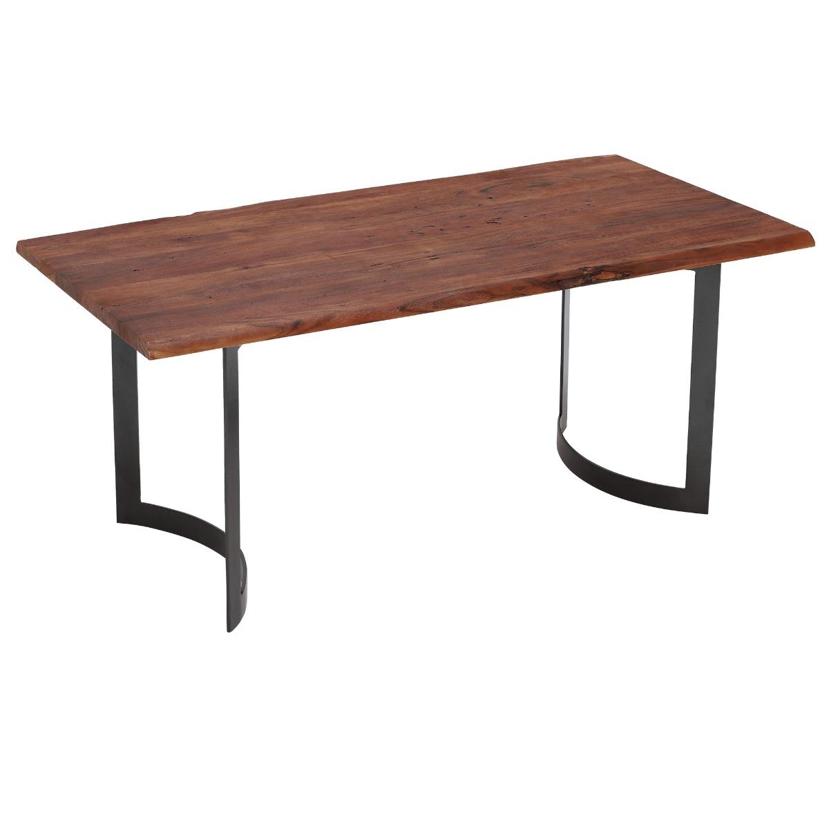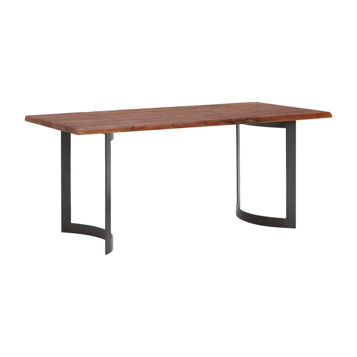 Design. The Zuri Dining Table comprises a classic solid acacia wood top, sitting above curved metal legs which create the illusion of a different look from every angle. This unusual piece allows for 6 chairs to fit around, ideal when it comes to hosting dinner parties and gatherings. The Zuri Dining Table will enhance your space whether it be modern or more classic.
