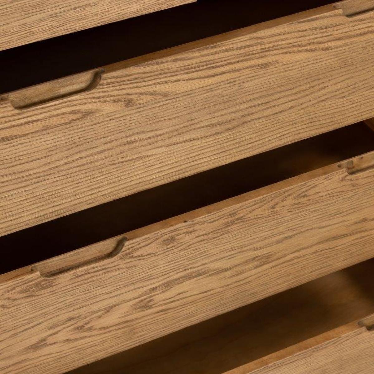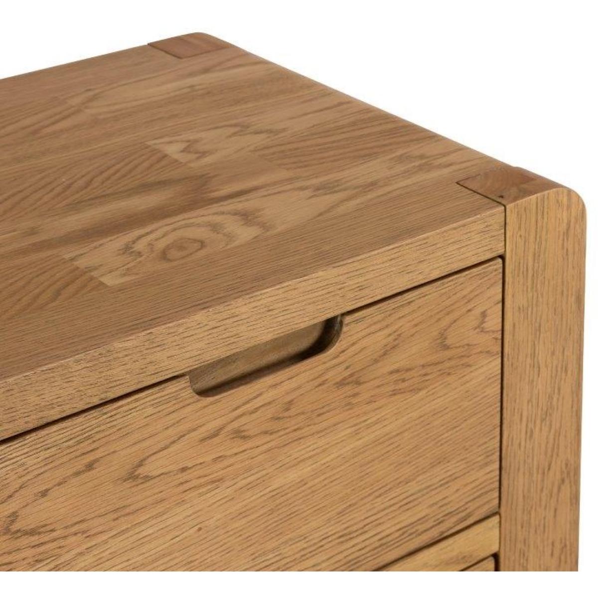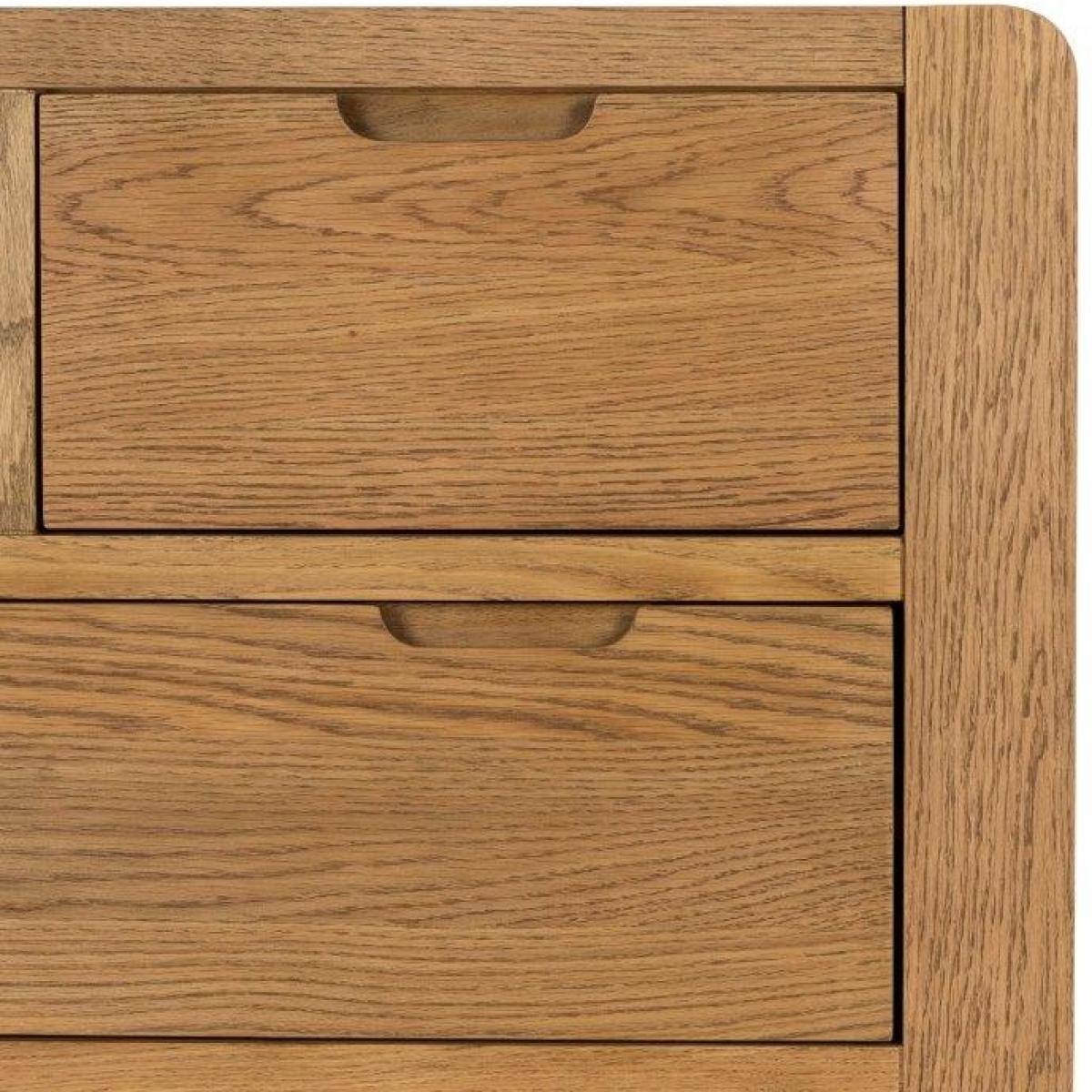 The Zurich Oak 2 Over 3 Chest of Drawers is beautifully made from solid oak and oak veneers and finished in a natural oil, the Zurich collection showcases many unique features including inset handles, soft rounded corners and exaggerated exposed wood grain. Ideal for storage of t-shirts, jumpers, and other items, the 2 smaller drawers sit above 3 generously sized drawers. Features: Fully assembled Made from oak with selected oak veneers Sturdy Storage Drawers Dimensions: Width 100cm Height 109cm Depth 42cm All screens vary in colour reproduction and whilst every effort has been made to display the colour as accurately as possible it is for guidance only.