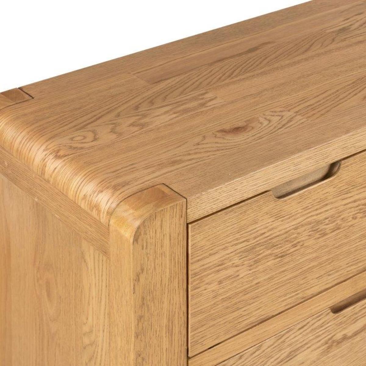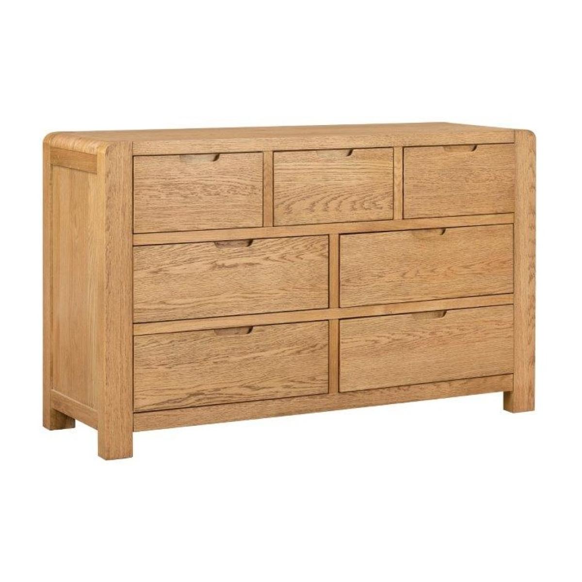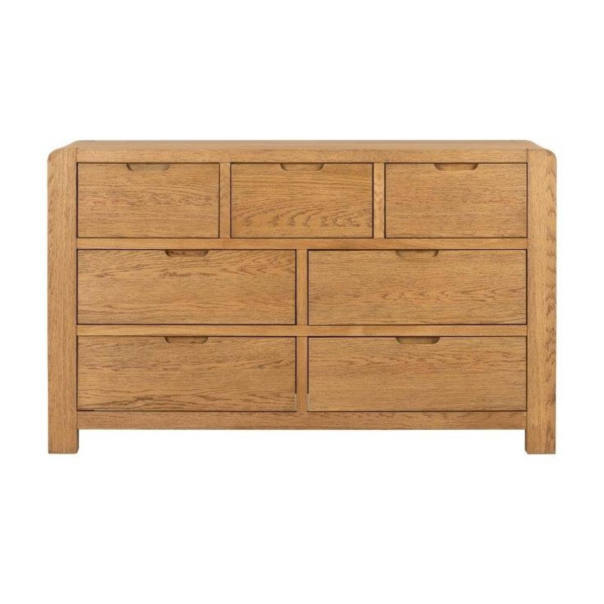 The Zurich Oak 3 Over 4 Chest of Drawers is beautifully made from solid oak and oak veneers and finished in a natural oil, the Zurich collection showcases many unique features including inset handles, soft rounded corners and exaggerated exposed wood grain. Ideal for storage of t-shirts, jumpers, and other items, the 3 smaller drawers sit above 4 larger drawers. Features:  Fully assembled Sturdy storage drawers Made from oak with selected oak veneers Dimensions: Width 140cm Height 86cm Depth 42cm All screens vary in colour reproduction and whilst every effort has been made to display the colour as accurately as possible it is for guidance only.