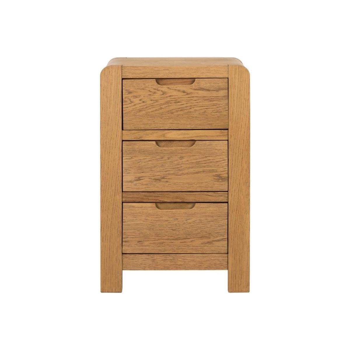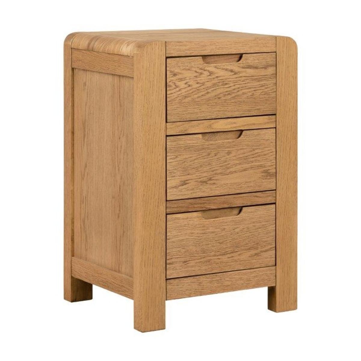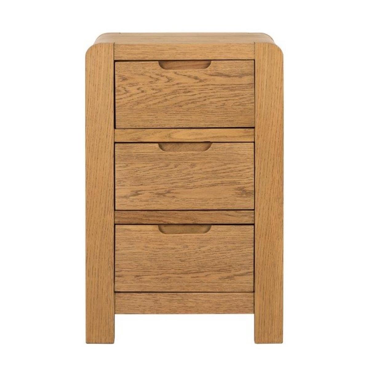 The Zurich Oak Bedside Table is beautifully made from solid oak and oak veneers and finished in a natural oil, the Zurich collection showcases many unique features including inset handles, soft rounded corners and exaggerated exposed wood grain. This bedside table has three drawers for those bits and bobs you need nearby during the night. Features: Fully assembled Made from oak with selected oak veneers Sturdy drawers Dimensions: Width 45cm Height 70cm Depth 40cm All screens vary in colour reproduction and whilst every effort has been made to display the colour as accurately as possible it is for guidance only.