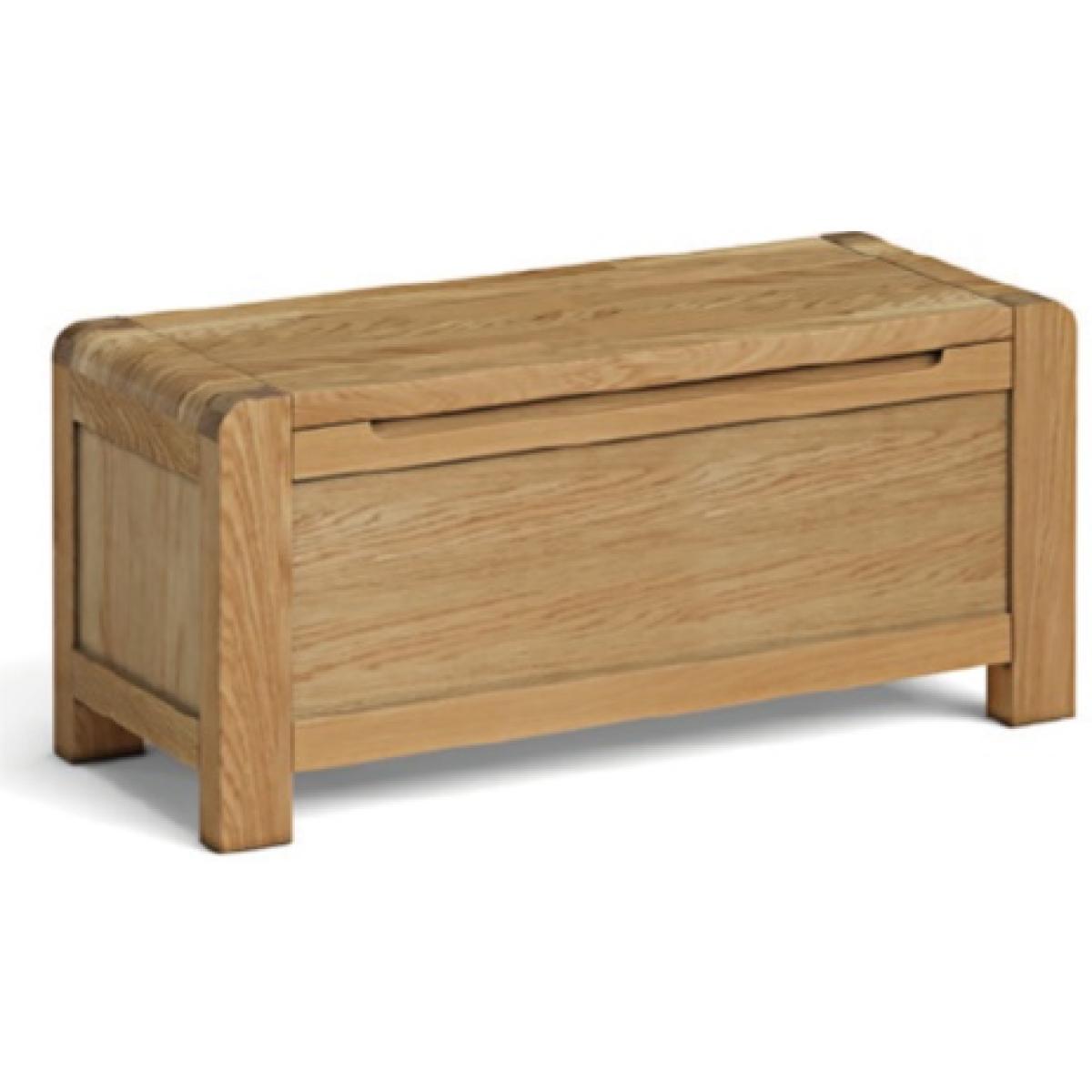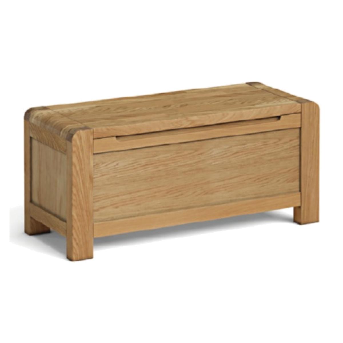 The Zurich Oak Blanket Box is beautifully made from solid oak and oak veneers and finished in a natural oil, the Zurich collection showcases many unique features including inset handles, soft rounded corners and exaggerated exposed wood grain. Perfect for that spot of space at the foot of the bed or as a handy perch to put your socks on, the Zurich blanket box can be used for storage of winter woollies or your spare bedding and blankets. Features: Made from oak with selected oak veneers Fully Assembled Dimensions: Width 100cm Height 45cm Depth 40cm All screens vary in colour reproduction and whilst every effort has been made to display the colour as accurately as possible it is for guidance only.