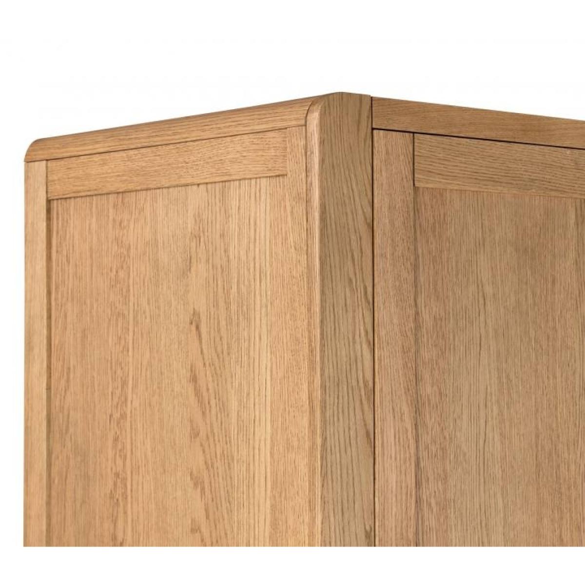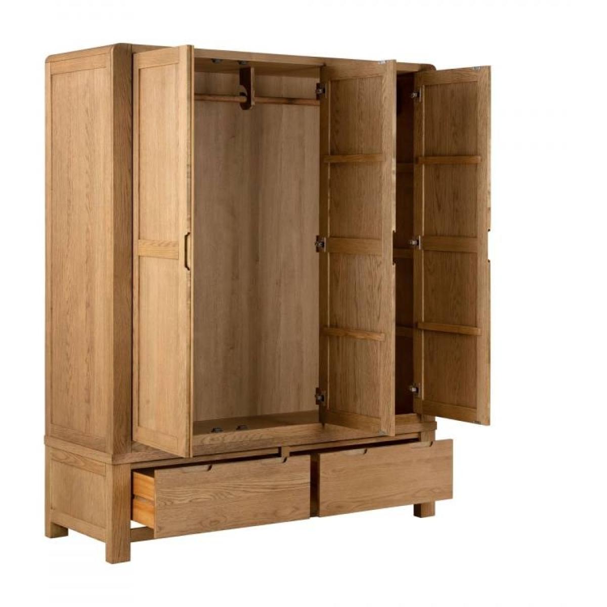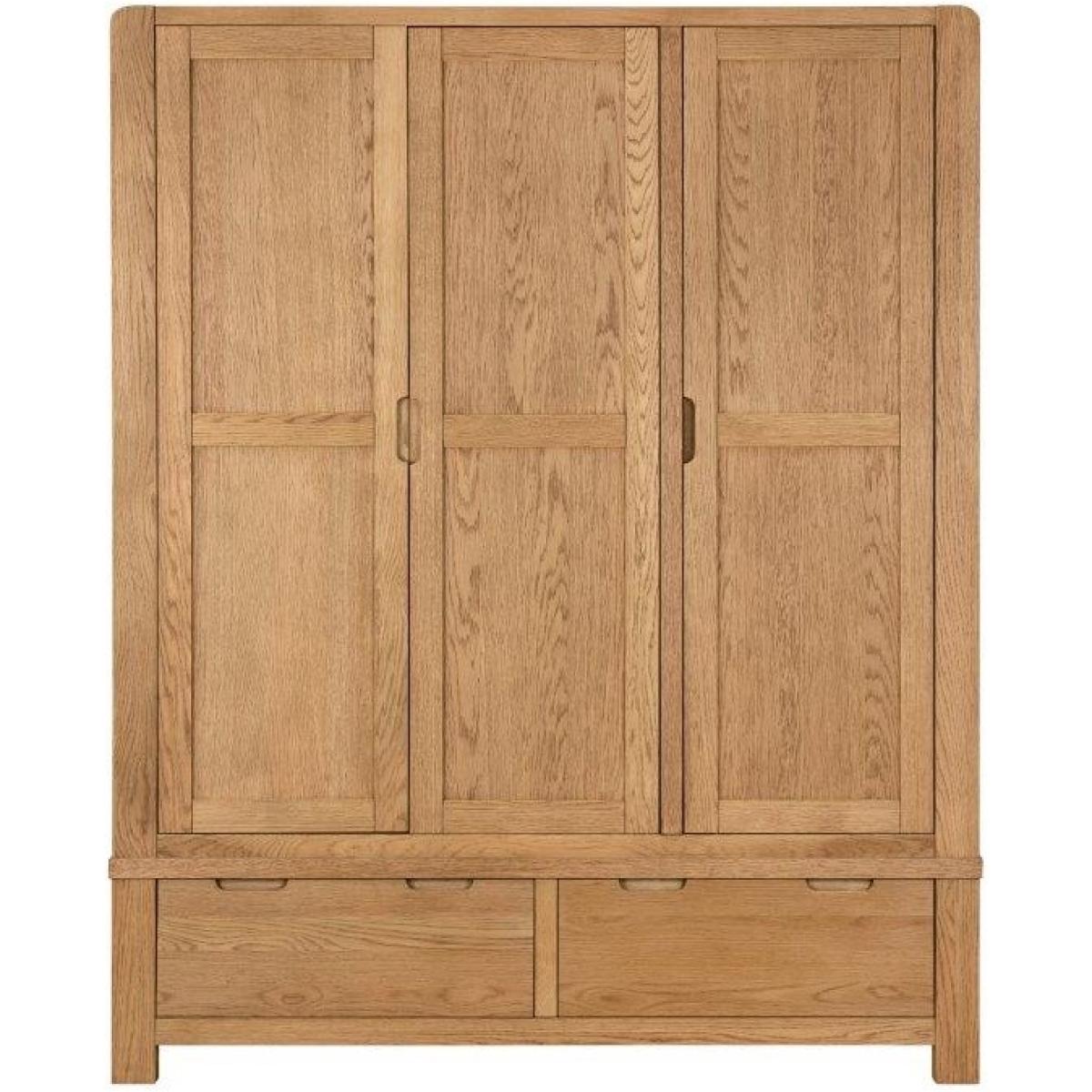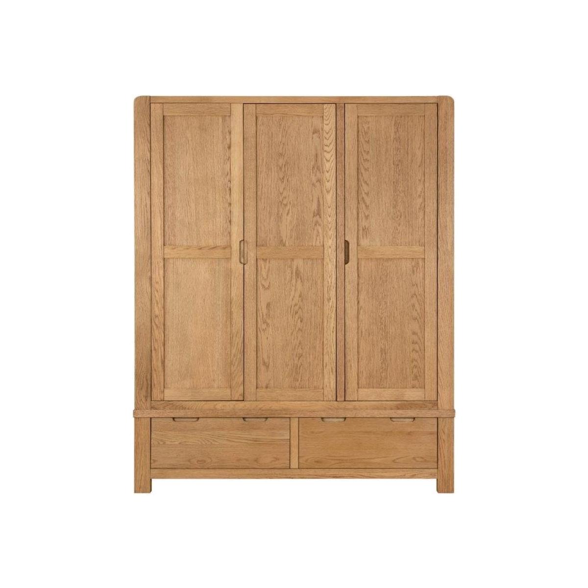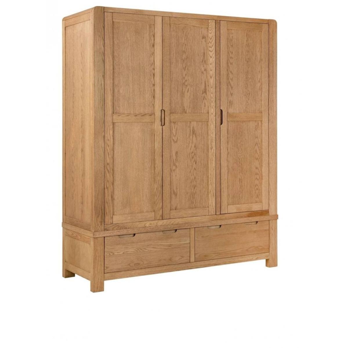 The Zurich Triple Combination Oak Wardrobe is beautifully made from solid oak and oak veneers and finished in a natural oil, the Zurich collection showcases many unique features including inset handles, soft rounded corners and exaggerated exposed wood grain. With 3 doors hiding a generous amount of hanging space and two lower drawers, outfits are perfectly stored inside this wardrobe. Features: Flatpacked for home assembly and ease of delivery. Made from oak with selected oak veneers Double & single section with hanging rail Dovetail joints to drawer fronts Dimensions: Width 159cm Height 196cm Depth 58cm All screens vary in colour reproduction and whilst every effort has been made to display the colour as accurately as possible it is for guidance only.